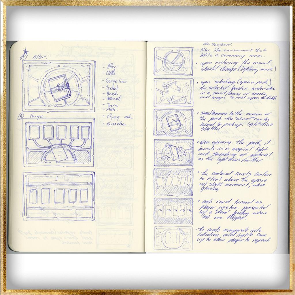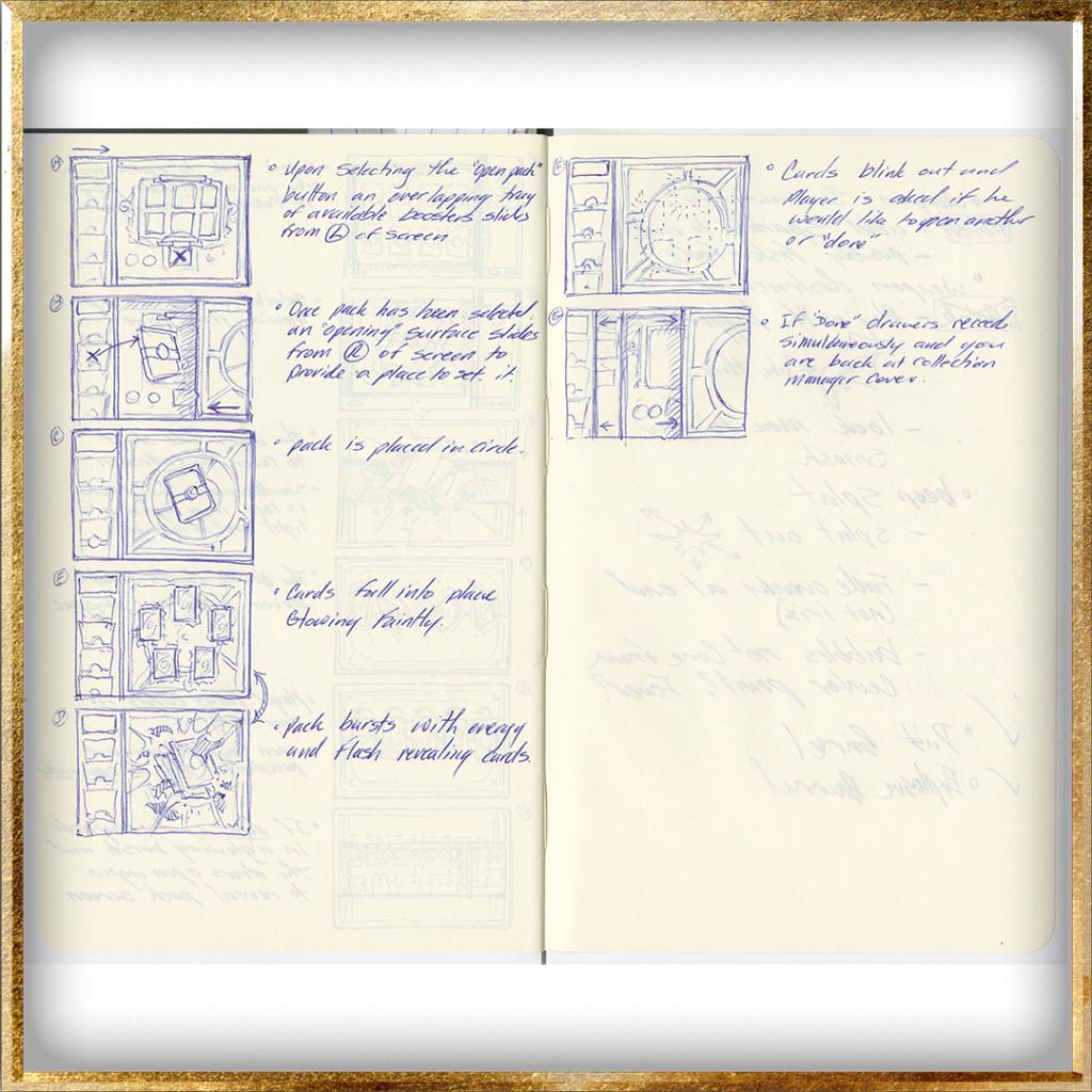 These sketches come from Ben Thompson, who left Blizzard in 2019, and showcase early looks at card packs, the collection manager, and interface for the Forge (Arena). Check out the images and our observations down below.