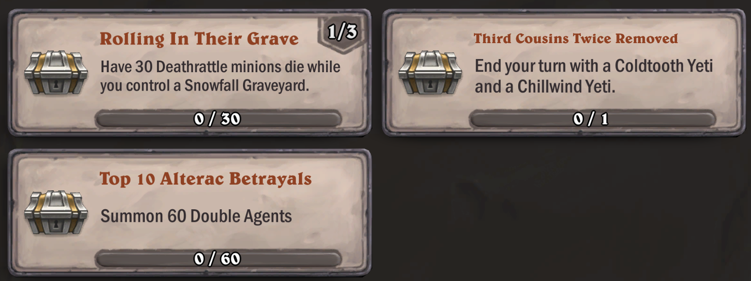 Requirement: Have 30/60/120 Deathrattle minions die while you control a Snowfall Graveyard.