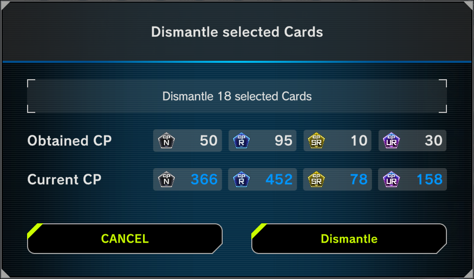 - When Dismantled, each card will generate the following amounts of CP: