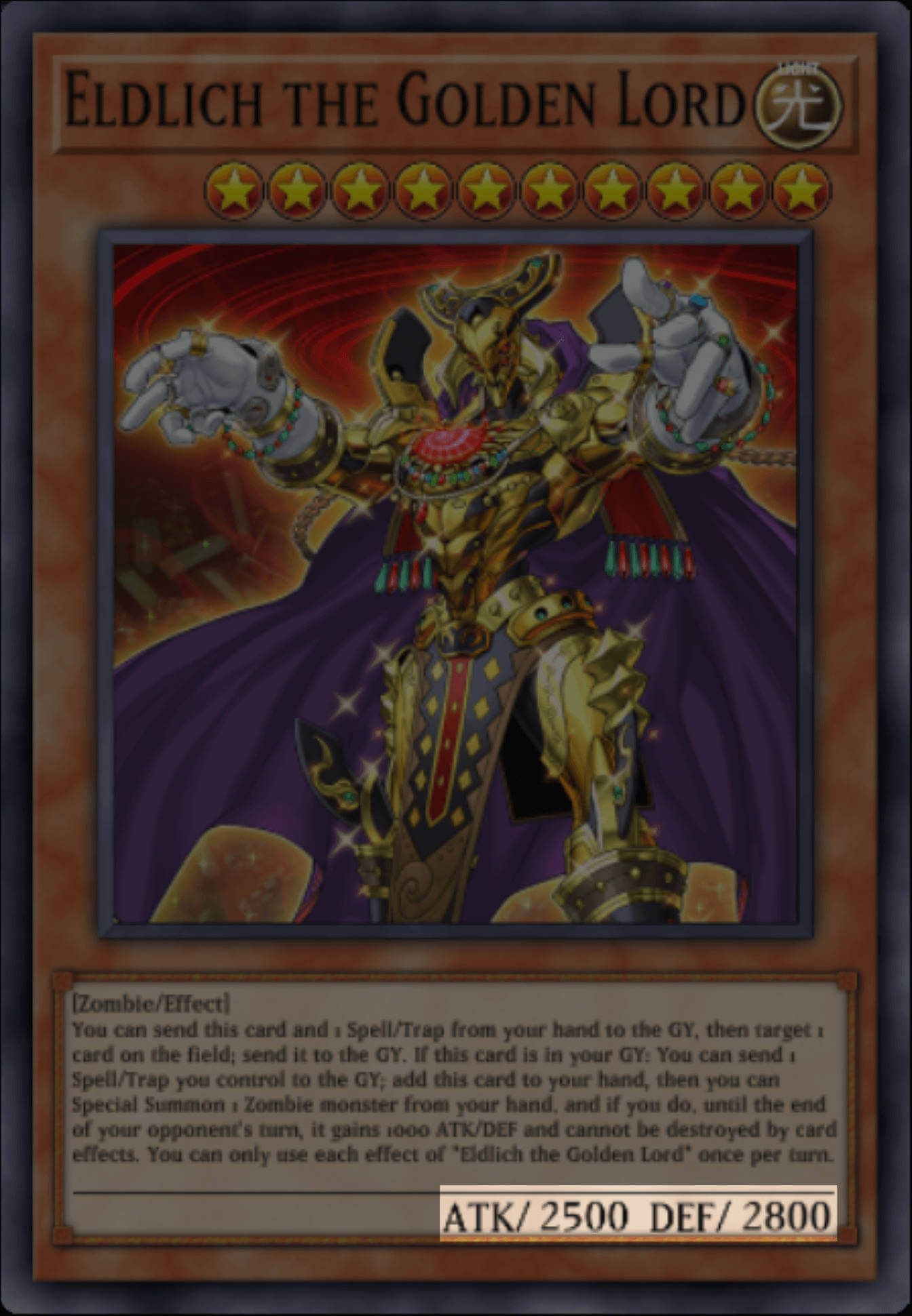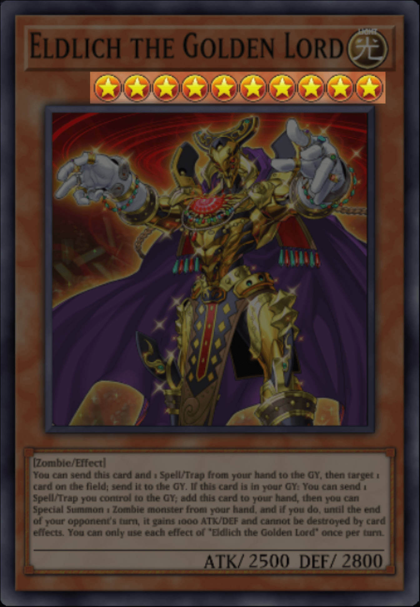 Each card has it's own unique name, which is used to identify the card. Names are very important in Yu-Gi-Oh, as lot of cards will use key words (not keywords, we don't do that here) in a card's name to activate their effect. For example, Cursed Eldland has an effect that allows you to add an "Eldich" or "Golden Land" card to your hand, meaning you can get any card with these words in their name into your hand, like Eldlich the Golden Lord, Golden Land Forever! and Conquistador of the Golden Land.