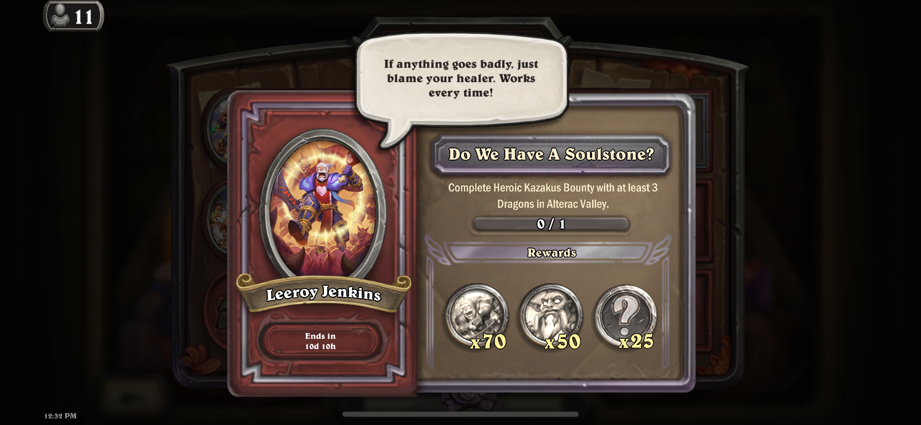 - Reward: 75 Leeroy Jenkins Coins, 50 Deathwing Coins, 25 Random Coins.