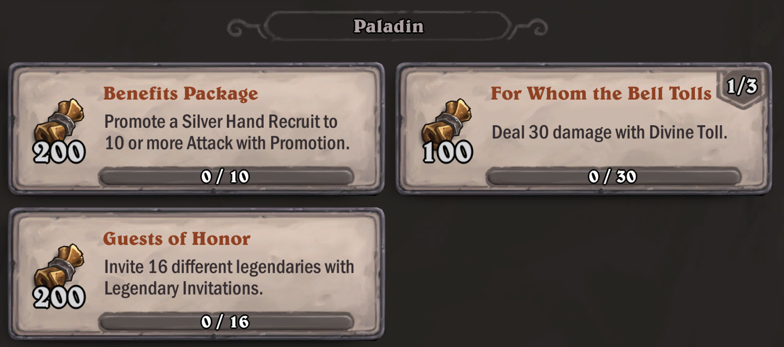 Having all of this said, we suggest you to complete For Whom the Bell Tolls without focusing on it: the card seems to be good, so just play some (Pure) Paladin and you'll eventually get there. For those of you that still want to grind this achievement, here's a spell generation heavy list that will allow you to create additional copies of Divine Toll for extra progression.