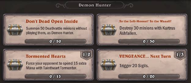 Demon Hunter continues getting fairly easy things to do, although this particular bunch may take a while to finish and greatly test your patience in the process. Maybe you already got some progress here and there by playing some of the regular decks. At least it's possible to throw everything together for that gradual completion with each consequent game, if that's your wish: