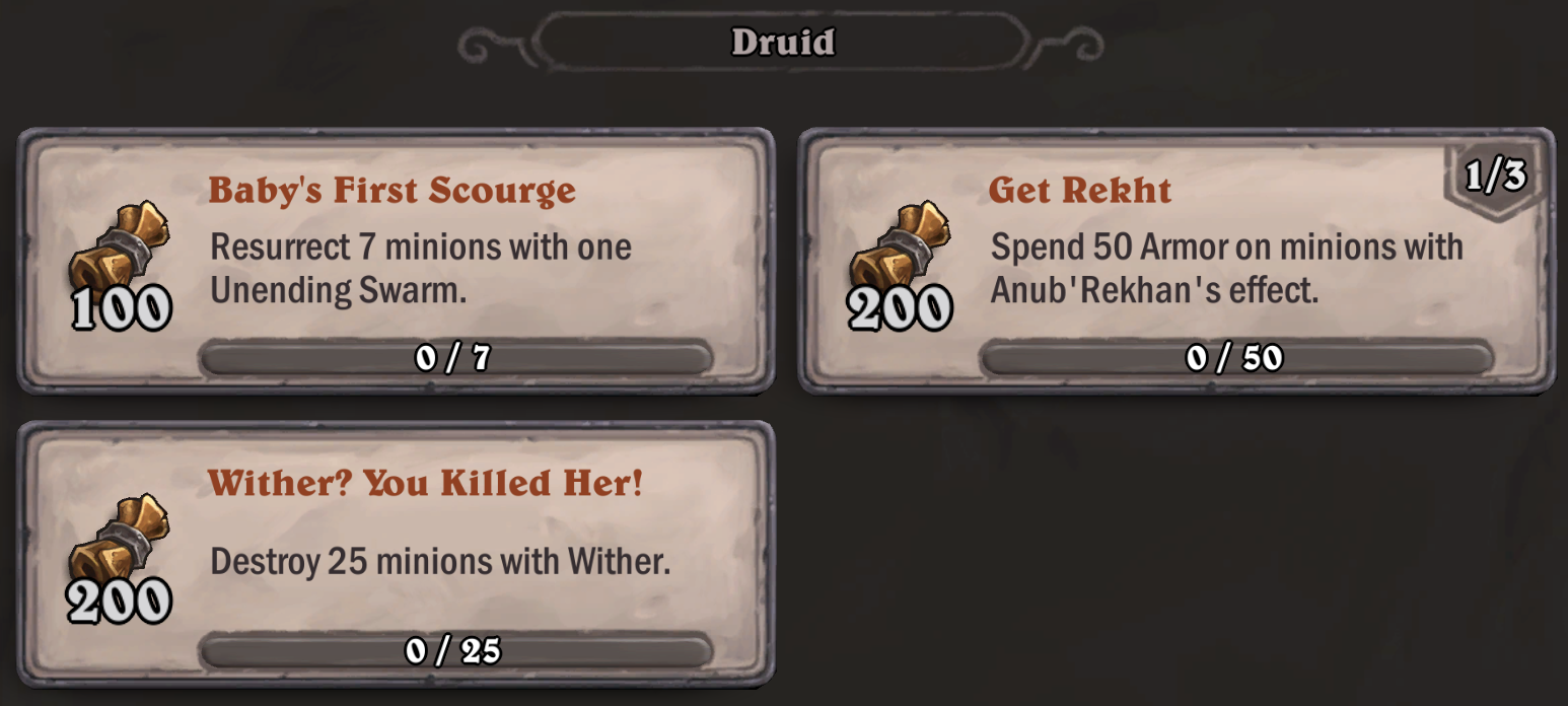 - Get Rekht - Spend 50/100/200 Armor on minions with Anub'Rekhan's effect.