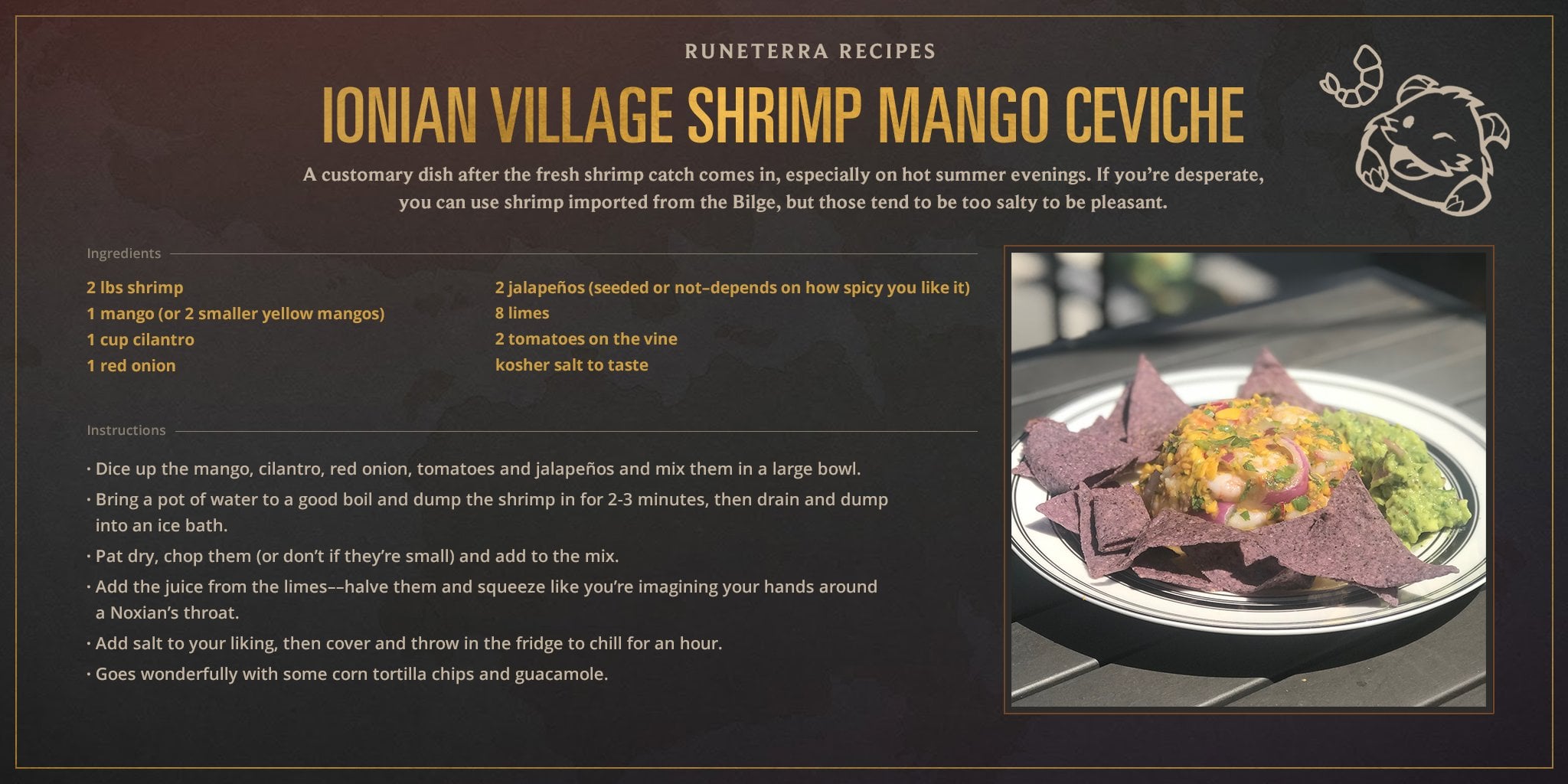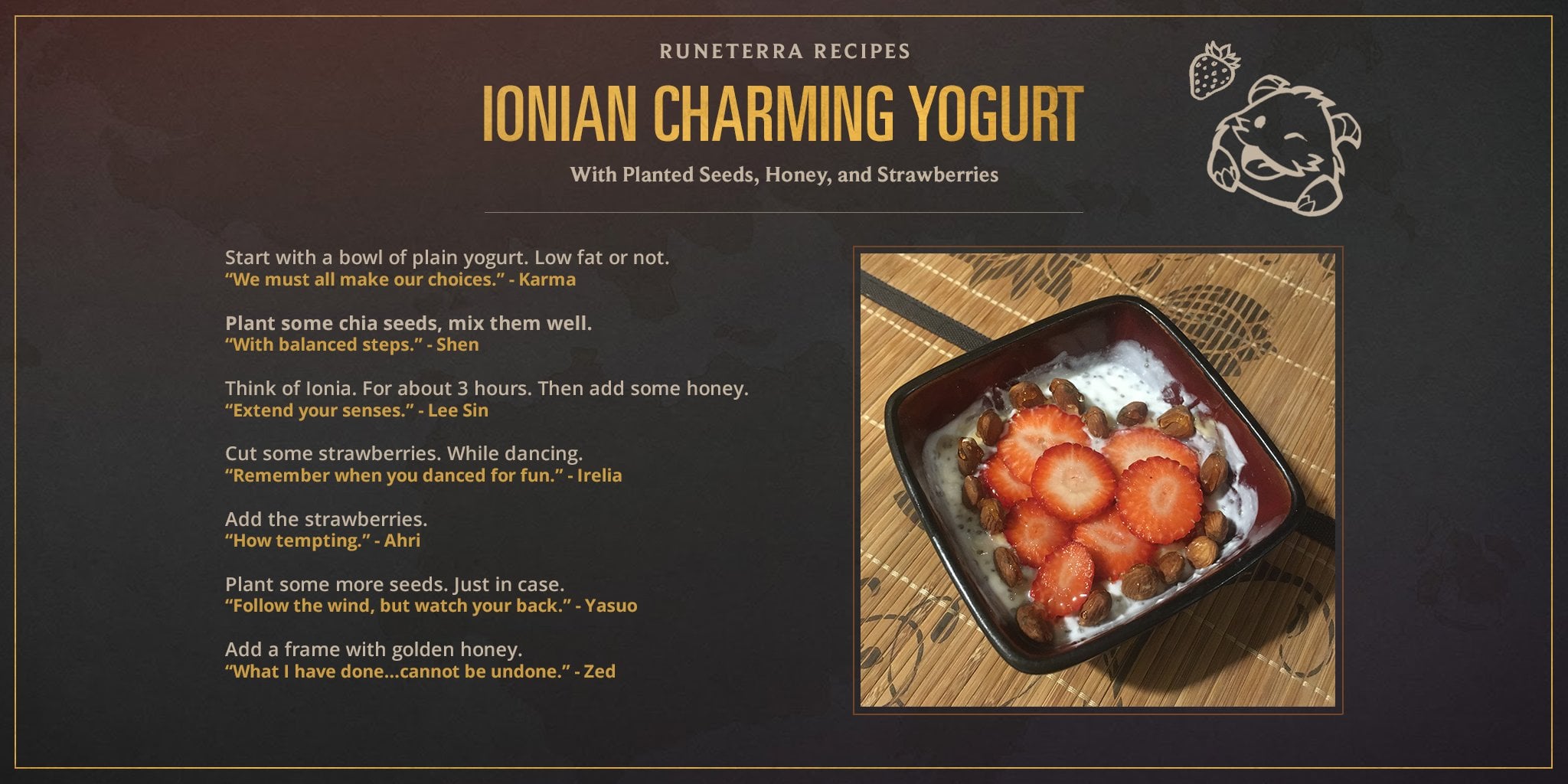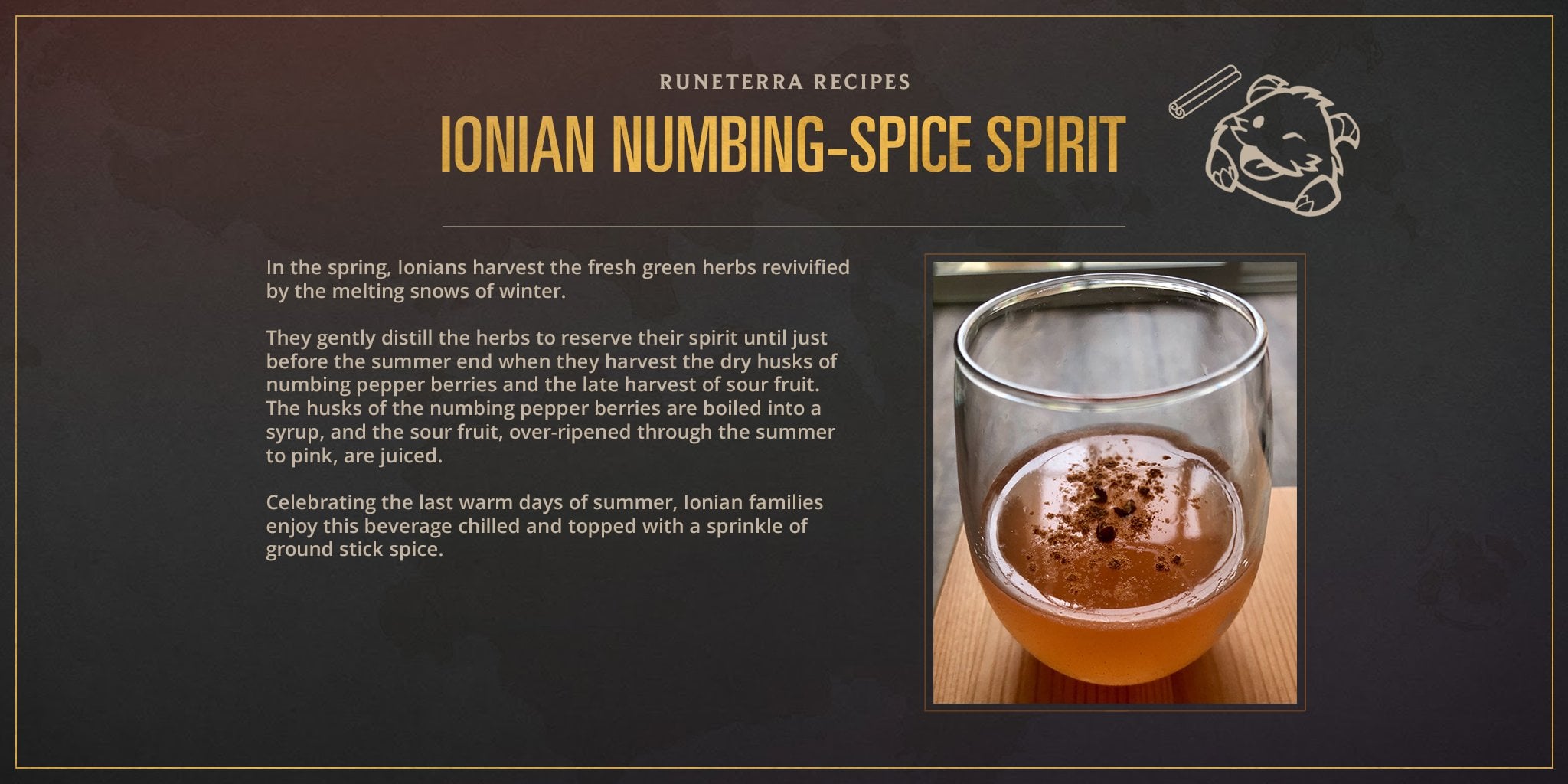 Riot Games celebrated the launch of Legends of Runeterra internally with a Faction Wars tournament. Rioters created recipes themed around each of the regions of Runeterra and today, some of the Ionian recipes have been shared with us!
