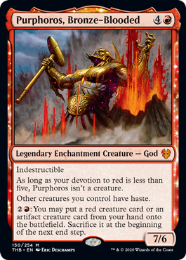 The final bit of our gameplan is to give one of our bombs haste to be able to enter the red zone the turn they hit the field. The best haste providers in the deck are Maximize Velocity, Escape Velocity, and Purphoros, Bronze Blooded.