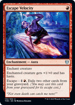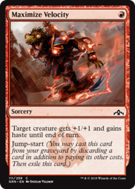 The final bit of our gameplan is to give one of our bombs haste to be able to enter the red zone the turn they hit the field. The best haste providers in the deck are Maximize Velocity, Escape Velocity, and Purphoros, Bronze Blooded.