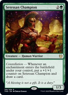 At first glance, Nessian Wanderer doesn’t seem to do much, its an ok body with an ok ability for the most part attached to it. However, it is an absurd form of card advantage for any deck playing a decent amount of enchantments, as with about half the games I had played with it in this deck, I drew a majority, if not all, of the lands in the deck just by triggering his ability. Paradise Druid is also fairly underwhelming at first, but the fact its a mana dork and has hexproof a decent chunk of the time makes it a great target for all our auras, especially once we start using Calix to exile creatures under them. Setessan Champion is strong just because it gets large fast and makes sure we constantly have auras to attach onto our creatures. Siona, Captain of Pyleas gives us an enchantment when she enters the battlefield, as well as providing a lot of creatures when the ball starts rolling.