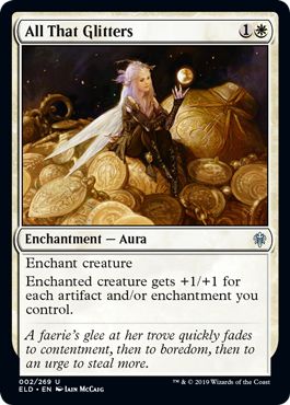 Once a creature is on the field, we need to start putting auras on them to make them viable threats. The ones that I have found to be the strongest are All that Glitters, Mantle of the Wolf, Sentinel’s Eyes, and Warbriar Blessing.
