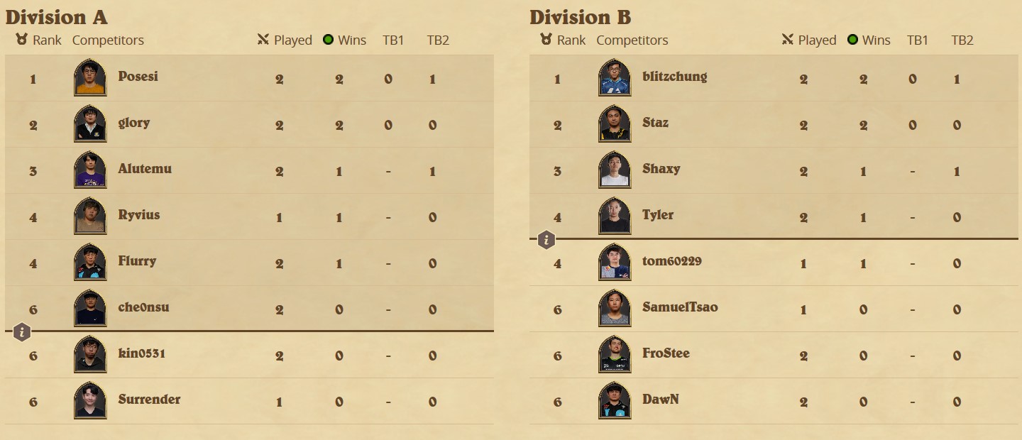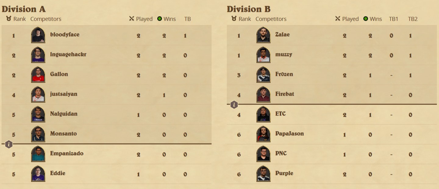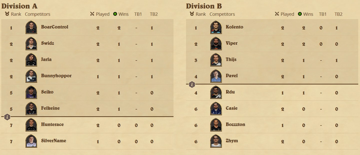 Result-wise, there's not much to discuss yet. As this was the first week of a four-week long period, nobody has yet secured their playoffs spot, neither has anyone got into irredeemable relegation troubles yet. The players going 2-0 got a good foundation to build on, and those falling to 0-2 have to pick up the pace in the coming weeks, especially if they're in the dreaded Division B.