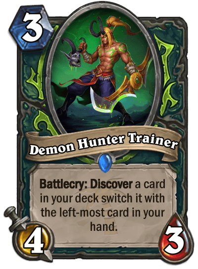 RenoLord: "It was both easier and harder. Because there significantly less cards for Demon Hunter the classes themes are harder to find, but also that means that much less design space was explored. When i designed the set for Demon Hunter i looked for some themes i found that quite a few cards deal damage cards like Priestess of Fury, Eye Beam and Chaos Nova and made a quest around that. Secrets of the Fel. Also made some cards that i just Demon Hunter would like. Like Deep Sea Fel, Demon Hunter Trainer and Fel Orc Blaster."