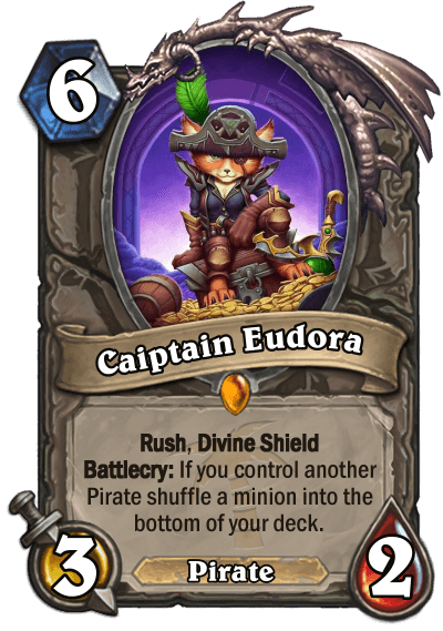 - Captain Eudora - My favourite Pirate of the set. Also shows the theme of shuffling cards into your deck. I designed her with the intent of her being powerful like Zilliax."