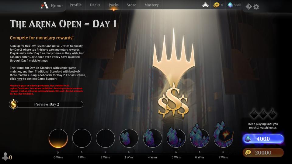 For day 1, you'll be eliminated as soon as you lose 3 games, gem prizing starts at 3 wins, and as mentioned before you can enter as many times as you want. If you want to get to day 2 though, you're going to need to hit 7 wins during the first day to unlock the day 2 ticket. The competition will be quite a bit more fierce on day 2 as the format switches over to best-of-three with sideboard, and you'll need to make it all the way up to at least 6 wins to earn any cash. You'll also need to make it to day 2 and get a single win if you want to break even on your investment.