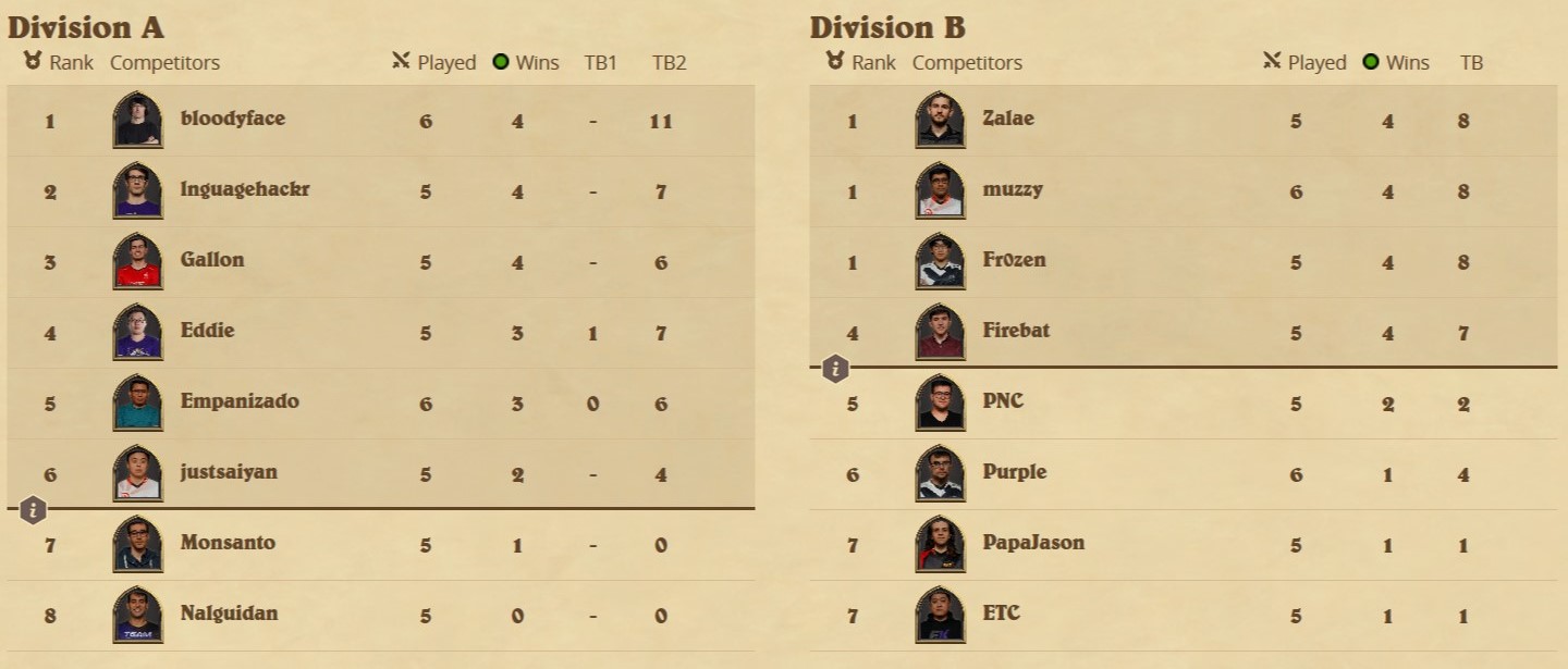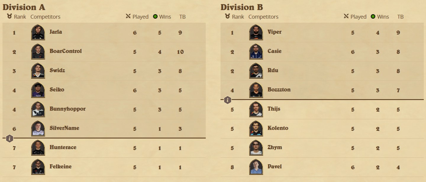 In Europe's Division A, the battle for the sixth playoff spot (and avoiding the relegation spots) is likely going to be a three-way race between Felkeine, Hunterace, and SilverName, although it is not impossible for some of the 3-win players to get into tiebreaker troubles should more than one player of the aforementioned trio win both of their matches. With Felkeine and SilverName going head-to-head on Friday, Hunterace will have to win at least one of his matches to have any chance of advancing. Swidz will be able to help his compatriot (after beating him this weekend) as he will face both of Felkeine's rivals during the weekend. In Division B, nothing else but Viper's safety is guaranteed. Pavel is likely to stay in the trouble zone but all others might have to wait until the last match to be certain of their future.