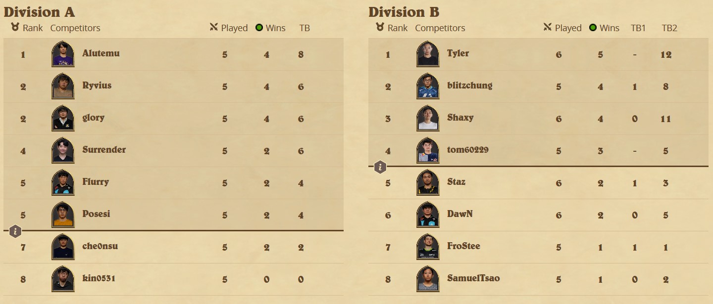 In Asia-Pacific's Division A, kin0531 is in big troubles. As he's still without a win, he'll need to win both of his matches next weekend to have any chance of avoiding the relegation play-in. The battle for avoiding the second unwanted spot is still on as four players are tied with 2 wins. As che0nsu has the worst tiebreaker of the four, he'll have the biggest need for wins. The top three of the division have already secured a Playoffs spot. In Division B, the bottom four are heading into relegation troubles. They all still have the smallest possibility of avoiding that fate but it requires nothing but wins from them in addition to tom60229 losing both of his remaining matches. The top three players are already safe and heading towards the "pre-Playoffs".