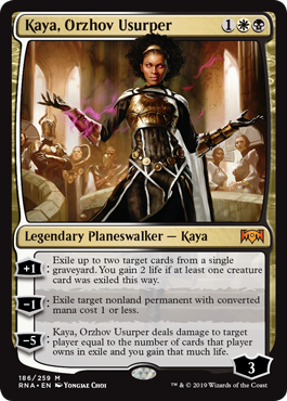 General Kudro of Drannith serves several purposes for our deck, with each of his abilities being relevant for our deck. His anthem effect is very strong as almost every one of our creatures is a human or makes humans. This often lets us overwhelm the opponents early on and helps us with closing out the game later on. Kudro’s second ability is very strong graveyard hate, which is hit or miss for a lot of matchups. A lot of the time it only helps make Kaya’s ultimate more threatening but in matchups against graveyard reliant decks, it puts in a lot of work. Kudro’s final ability is a great removal tool as often we have humans lying around and being able to chump two things then get rid of a third large creature is an amazing tool for helping us stall out the game and keeping the opponent in check.