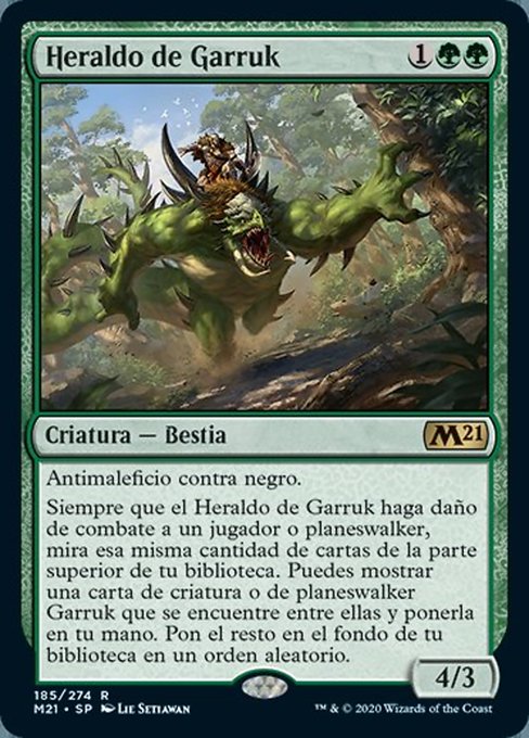 Whenever Herald of Garruk deals combat damage to a player or planeswalker, look at the same amount of cards from the top of your library, you may reveal a creature or a Garruk planeswalker card from among them and put it into your hand. Put the rest on the bottom of your library in a random order.