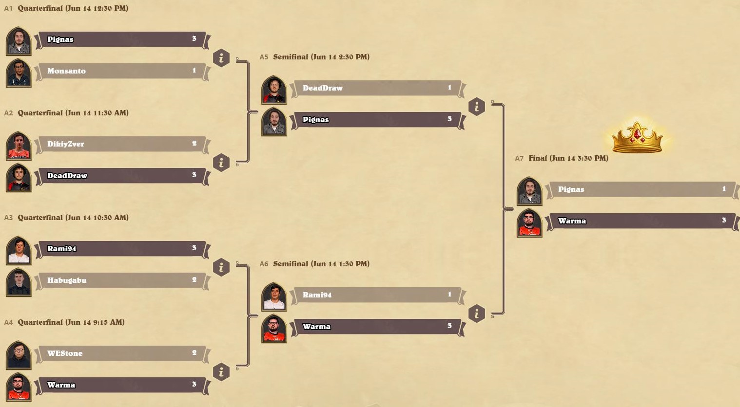 For Europe, it wasn't over until it was over. With five Europeans reaching the top 8, only xBlyzes was able to be certain of his spot before the competition ended on Sunday. AyRoK had to fear for his place the entire time but was able to hold on to it as his compatriot Warma triumphed over Pignas in the final. This was another agonizing result for DeadDraw, for whom this was the third top 8 and second top 4 in last two years, as he narrowly missed GM promotion for the second time with Pignas beating him in the semifinal.