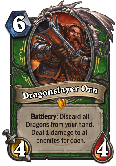 MrRhapsody: "The set is about a "what if?" war between the Dragonslayers and the Dragonkind. The Dragonslayers were a group created by Dia the Time Breaker and Dragonslayer Orn dedicated to kill evil dragons, but as time passed, they were convinced by Dragoncloner Nefarian that the whole dragonkind is a plague that should be stopped, and with the help of a new powerful weapon know as Dragon Essence Extractor, wich aborbs a dragon's power and transfer it, they declared a war againts the dragon kind. The Discard mechanic is a way to show the Dragon Essence Extractor in use, by using a dragon's power to boost yours and then discard it like it was nothing, a good example is Dragonslayer Apprentice. Something worth sharing is that ALL dragons used by them, like Constructed Dragon, Bronze Highkeeper, Spawn of Kalysera, Draconid Protector, etc, are all constructs or slaves, none of them servers the Dragonslayers on purpose. Another thing worth mentioning is that i play only Wild mode, the land of the High powerlevels, so you guys should expect a very high power level in this set."