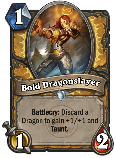 MrRhapsody: "The idea came when i was making the Dark Souls expansion. I was creating the cards for the expansion and i was wondering how to proplerly introce the Silver Knights from dark souls, wich were dragonslayers, into the game. I thought destroing enemy dragons was too especific and boring, and destroing you own was kinda of slow, since dragons usually are high costed. It was when i've maked the comparison with the in game dragon mechanic, "The dragon's servents gain bonuses from holding a Dragon, so what about make the Dragonslayers gain bonuses from...discarding them?" and BOOM, i was done. The first card i've made with this mechanic was Silver Squire, wich was very similar to Bold Dragonslayer, but it had Charge and a 2/1 statline instead."