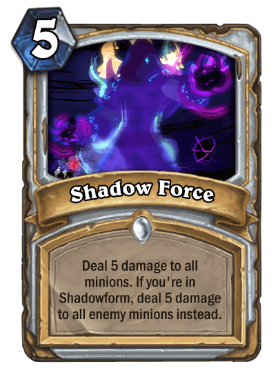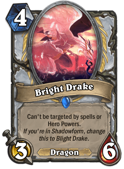 Pokeniner: "There's not many cards that didn't make the list because most of the cards were discussed long before we made actually copies of them. There are cards in this set that I wish got more support before their predecessors were removed from the game, these cards being Shadow Force and Bright Drake. I always loved the card Shadowform, but there was never any try to make it somewhat viable to play. I was going to have Priest get more Shadow support in my custom year, but I'm unclear on that now."