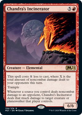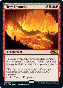 Fiery Emancipation has easily been one of the most fun cards I’ve played with from Core Set 2021. Unsurprisingly, dealing three times the damage you are supposed to do ends games incredibly fast and with the help of some of the larger burn spells, it is very well possible to just target the opponent for 20+ damage out of the middle of nowhere. Experimental Frenzy does not directly kill the opponent but gives us enough pseudo card draw to close out the game. Chandra, Awakened Inferno is a slow way of killing the opponent but most decks cannot deal with the continuous pings. Her not being able to be countered is great as it is one of our only ways of closing out games against control decks.