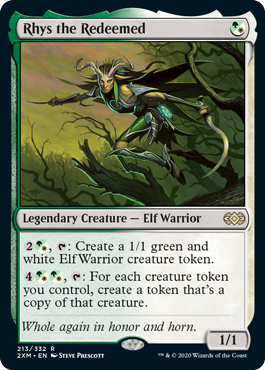 Emmara is a fairly straight-forward card. she attacks someone and makes a 1/1 token, which are two things we want to do in our deck. There are three other commanders though that compete with her in this same design space, these being Trostani Discordant, Ajani, the Greathearted, and Rhys the Redeemed, which out of all 4 I find Emmara to be the best. Trostani and Ajani both struggle from coming into play later than desired, making it harder to spiral a game out of control which is something I look for in a token deck. This leaves Rhys the Redeemed, which is a very strong card in Commander, the format. However, this mainly comes from her interactions with token doublers and her second ability to triple your tokens on board, which is something not possible in Arena right now. This leaves Rhys to be somewhat underwhelming in my opinion as her first ability is a poor rate and coming out turn 1 isn't very important when it is just a 1/1.