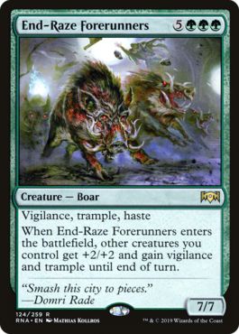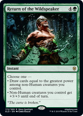 Once we fill the board we can focus on closing the game by making all of our small creatures massive with an overrun effect. The best cards we have to do this are Glorious Anthem, Return of the Wildspeaker, End-Raze Forerunners, and God-Eternal Rhonas.