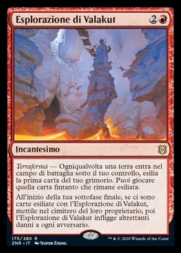 - At the beginning of your end step, if there's cards exiled with Valakut Exploration, put them in their owner's graveyards, then Valakut Exploration deals that much damage to each opponent.