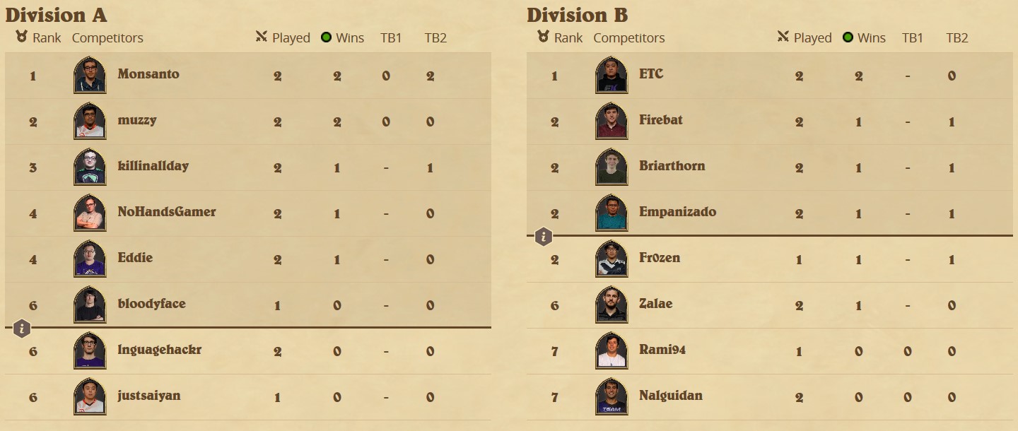 Last week's victorious Specialist decks seem to have had an impact on this week's choices. Rogue was the most popular class in APAC (15/16 picked it) a week after two Rogues made it to the top 4. Zoolock was significantly more popular globally after Viper's victory last weekend than it had been in the previous weeks. Eddie's infamous Turtle Mage also found its way to the lineups of six other players, even though Eddie himself chose not to bring it this week. Overall, Mage was the most selected class (39/48), followed by Warrior (34) and Priest (32). Paladin and Shaman were once again at the other end of things with zero picks, while Hunter was only trusted by BoarControl.