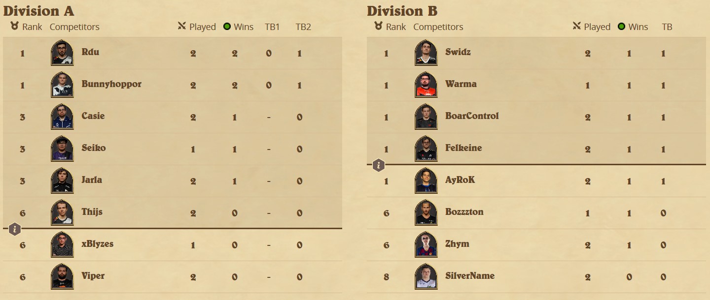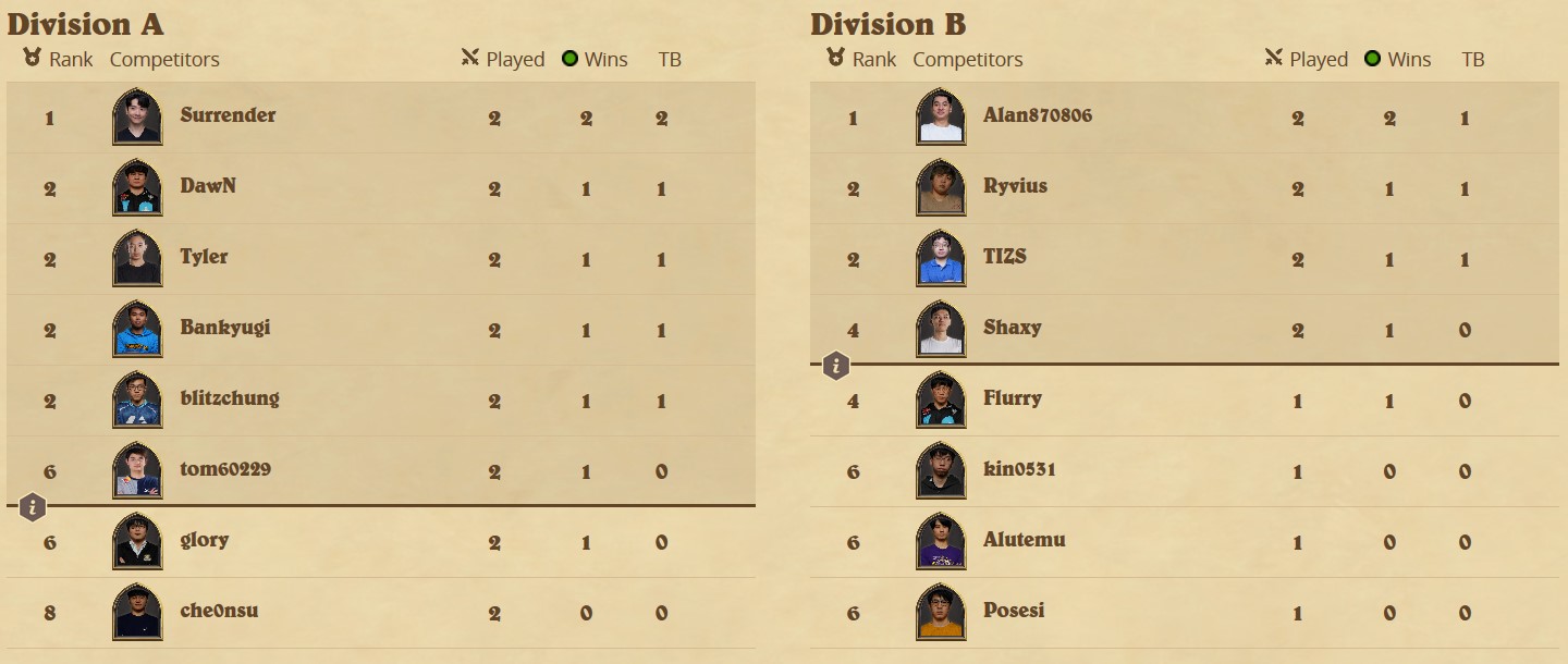 The individual match results can be found on the official site. Current standings within each Division can be found in spoilers below.