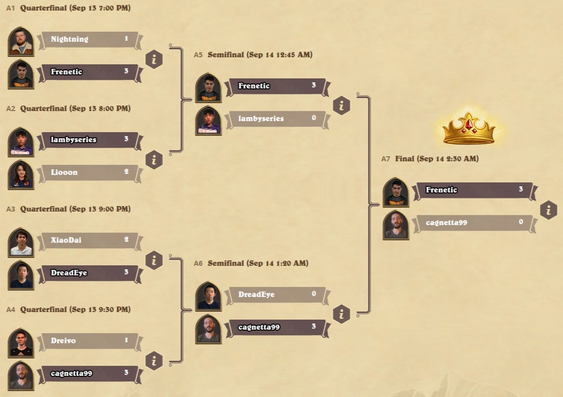Europeans continued to dominate the top end of the result sheet. Both Frenetic and cagnetta99 had to beat a fellow European to get to the semifinals, where both took convincing 3-0 victories over their respective opponents. In the end it was Frenetic, the only top 8 player with a "mere" 7-2 record from Swiss, who continued the impressive form and took another 3-0 victory for the title. In every other region this would've meant a guaranteed Grandmaster spot, but Europe will make Frenetic wait if he'll become the first Spanish Grandmaster or not.