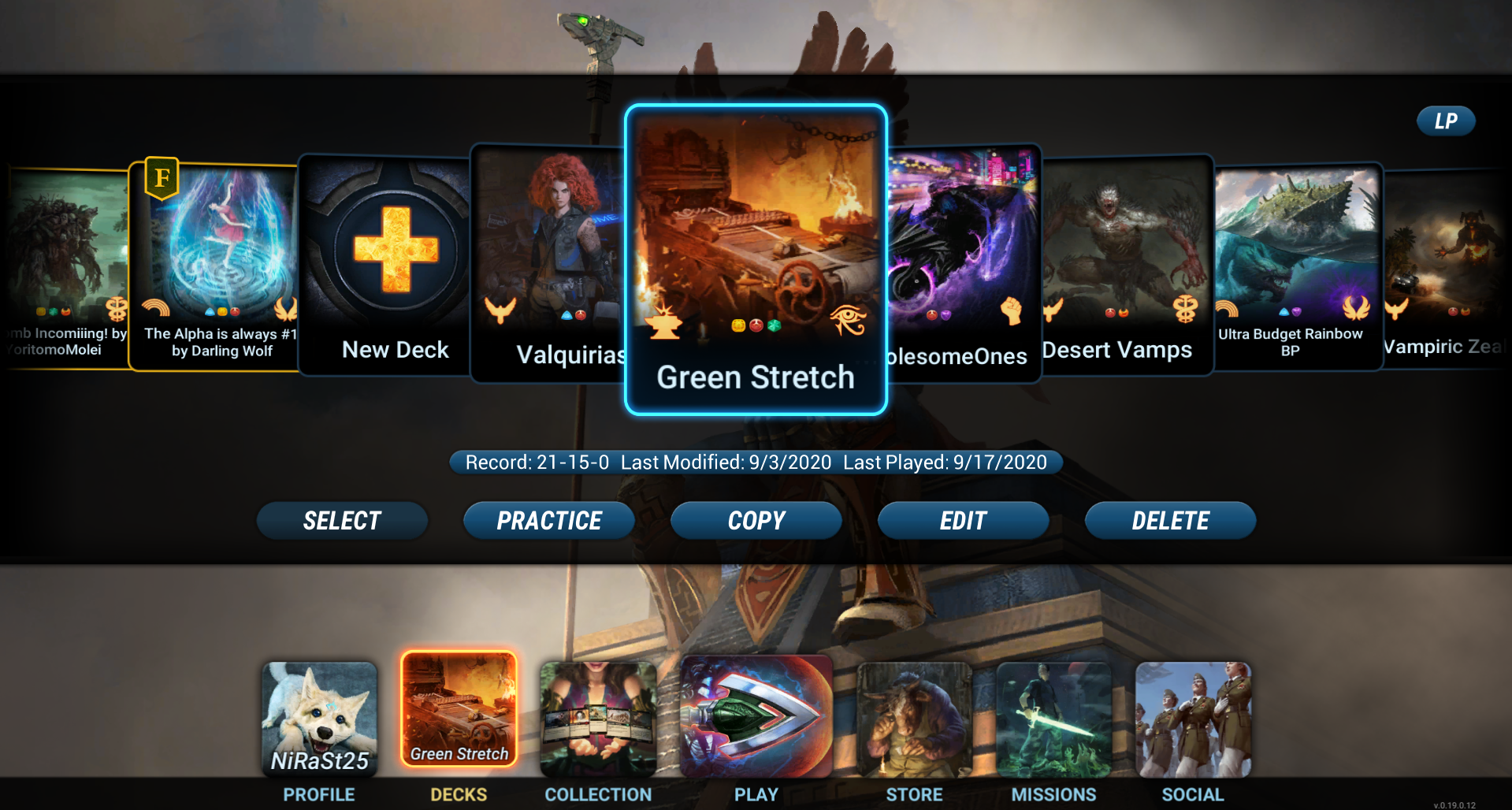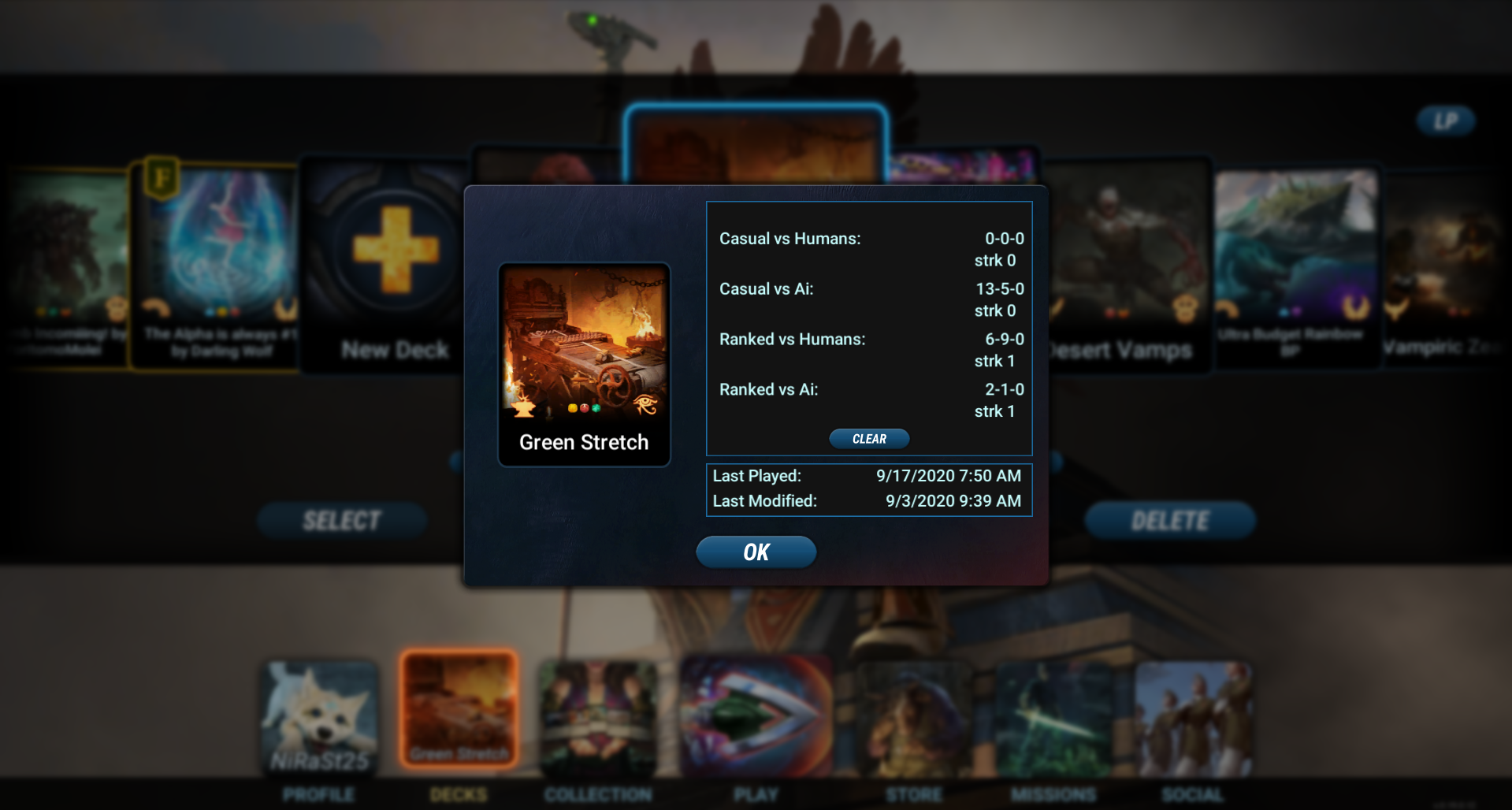 As you can see, this deck has a great win rate… against the AI. Not so much vs humans. Below the win-loss-draw score, you can see the "strk" which is how many matches you've won in a row with the deck.