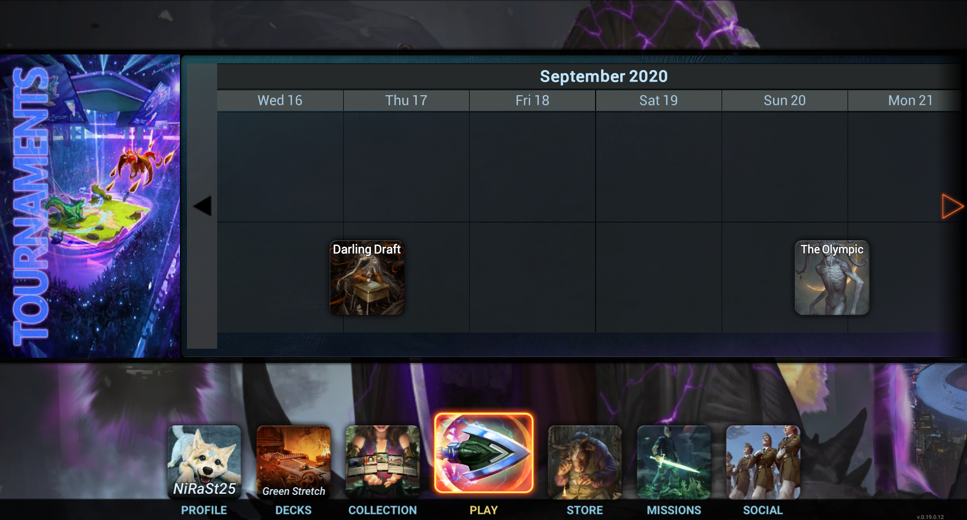 Finally, let's talk about what is probably Mythgard's most killer feature: the tournament client. You, yes, YOU can take part in or even organize your own tournament straight from the game itself. Just keep in mind that, while the game officially launched this past Friday, this part of the game is still considered in Alpha, and that entails a lot of bugs and missing functionality. To access the mode, press the Play button on the home screen, then press the 'Tourney' tab, and you should be presented with this screen: