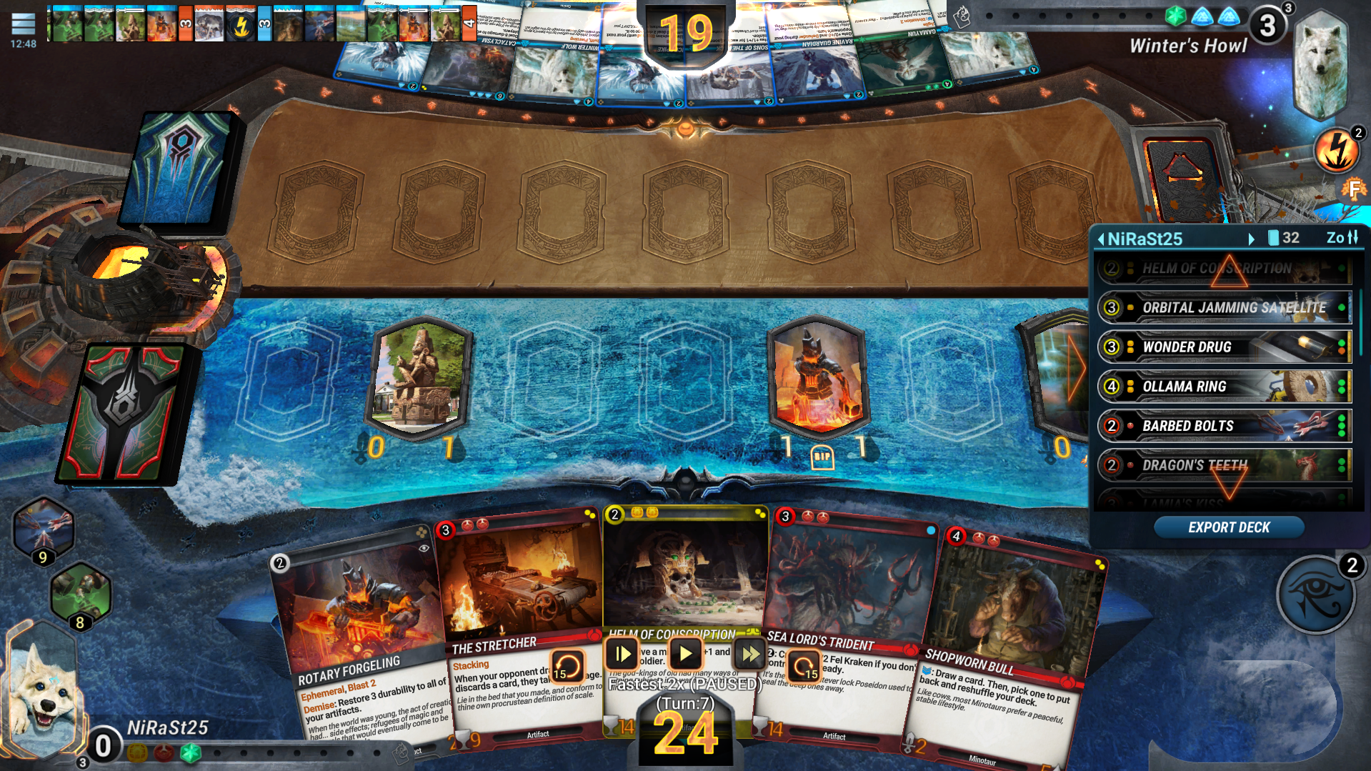 The deck itself is presented in a compact, scrollable fashion, with each card presented in a small line, comprised of its mana cost; it's gem cost; its name; part of the art; the number of cards left in that section (deck, hand or boneyard, it's the deck in the screenshot), with a faded dot meaning that many copies of the card were burned; and it's rarity. The 'Export deck' button is only available in replays, more on that in a moment, and is a good way of copying a deck you like.
