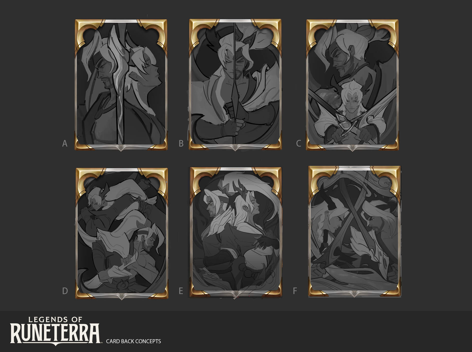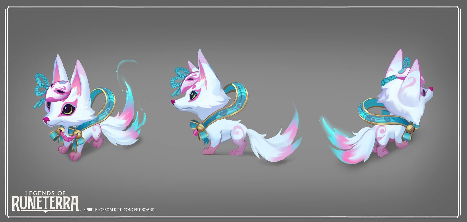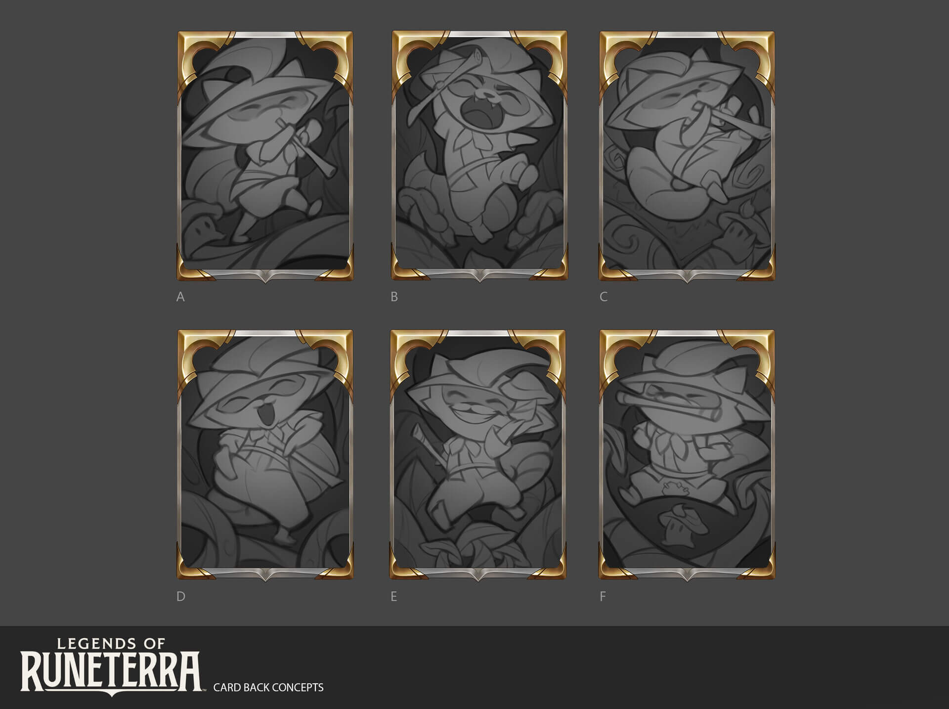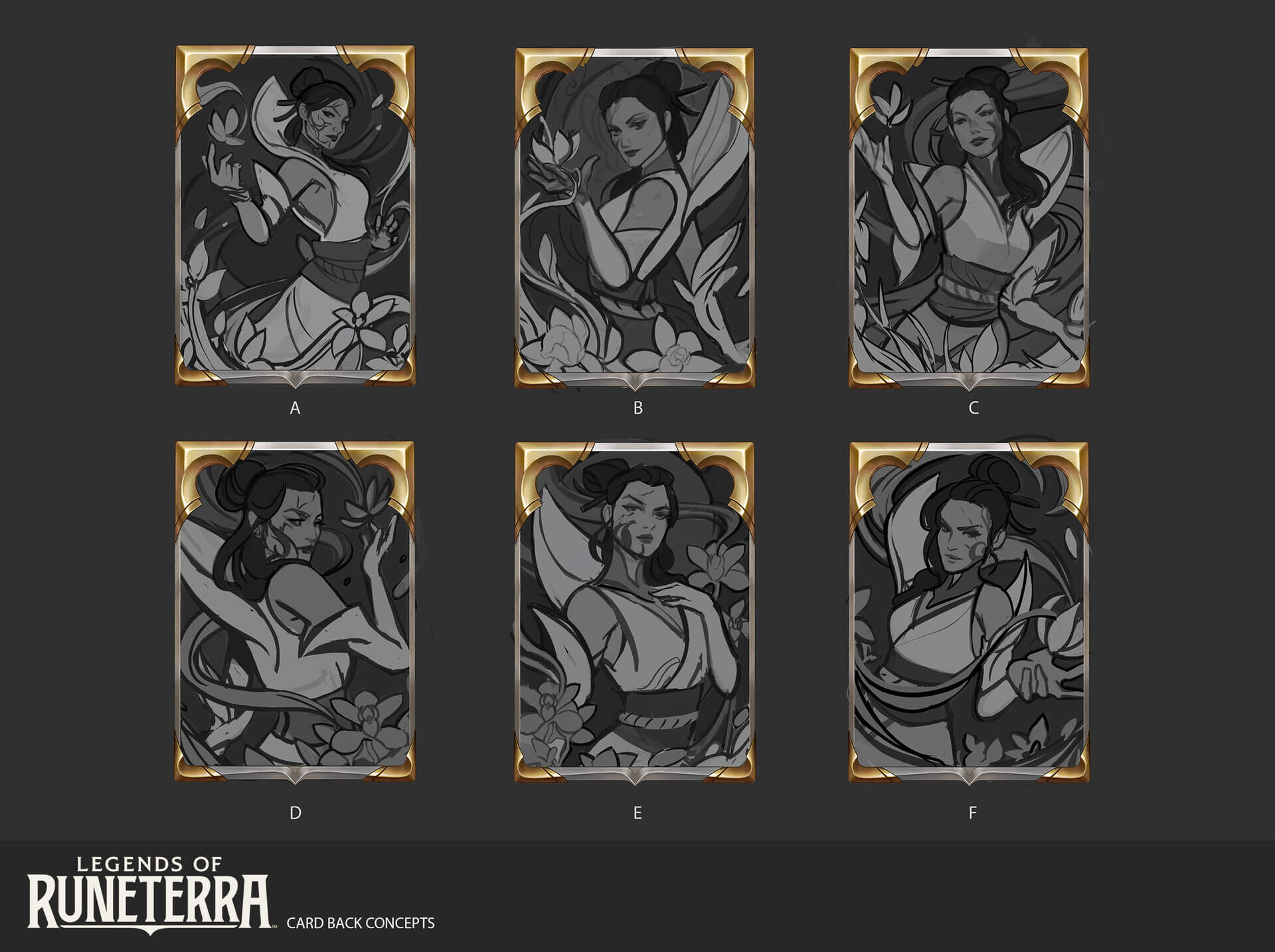 Spirit of the Bloom appears to depict Corina Veraza, making this the only card back in the game to use a character who does not appear in LoL and another card back to use a character of whom is not a champion. The final product appears to use a mirrored version of design B as the base.