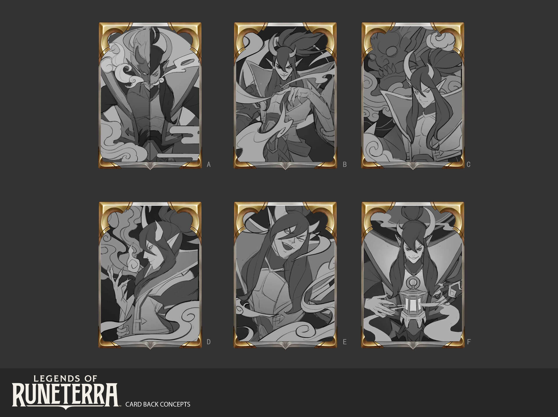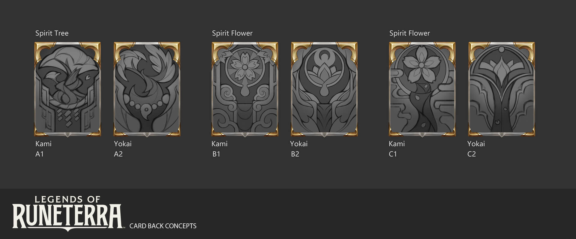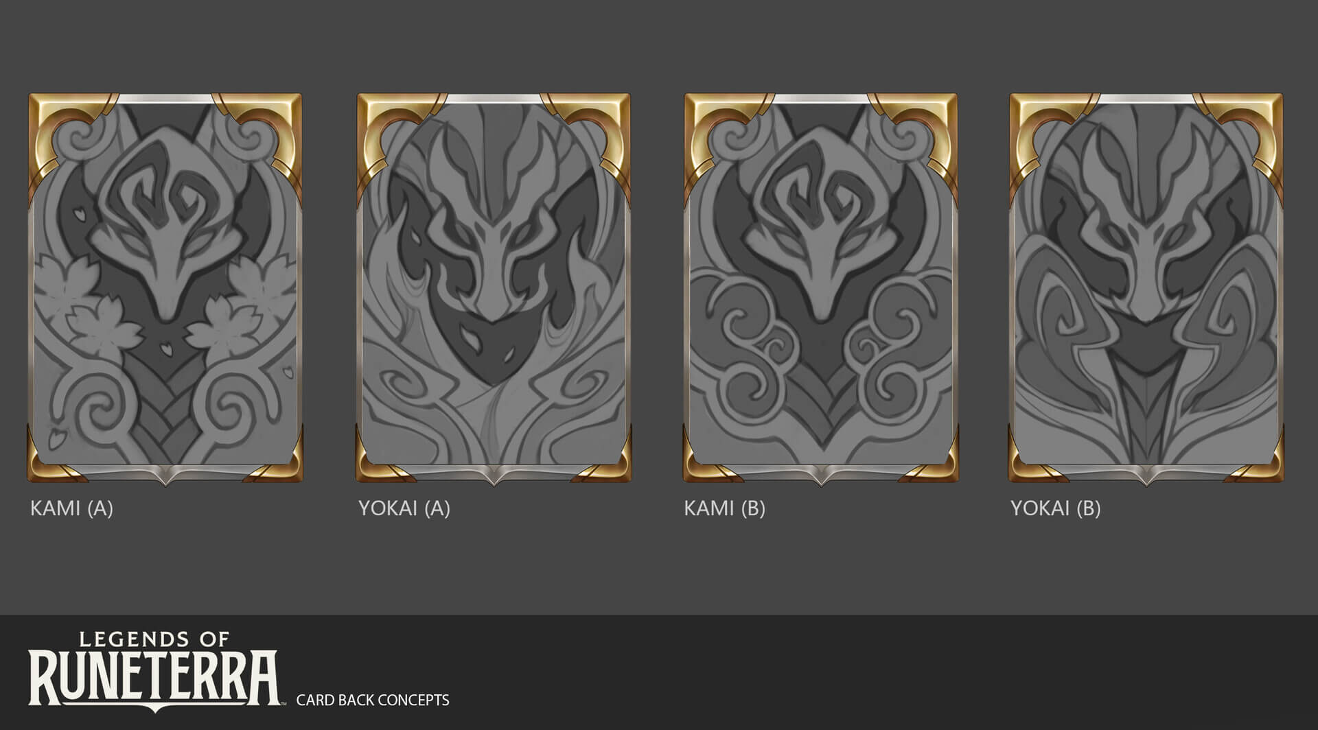 Two concept designs of Festival Spirit (referred to as "Kami" in the image) and Nightshade Spirit (referred to as "Yokai" in the image). The first design of both card backs would be used as the basis for their final respective designs.