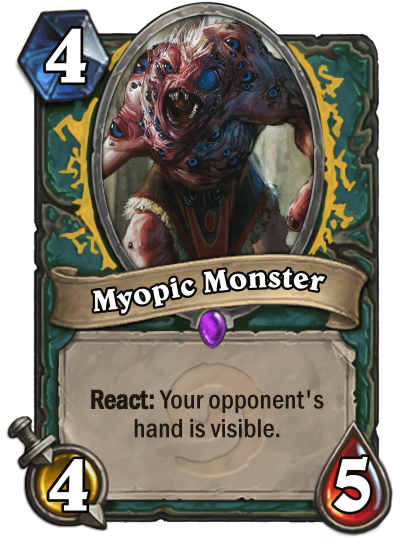 I had my base, and the first design I came up with was pretty cool, I thought - a minion with "React: Your opponent's hand is visible.", which encouraged the opponent to either kill it or play quickly, to prevent you from having too long to view their cards (though in practice you could take a screenshot or even just write everything down, obviously). I made something Poisonous on the opponent's turn, so that it was hard to attack into but not threatening to attack with. And then... I made a variation on Shimmering Courser. I made some that raised Attack. I started making less and less of them in general, focusing more on the other areas of the class which were so much easier to make interesting.