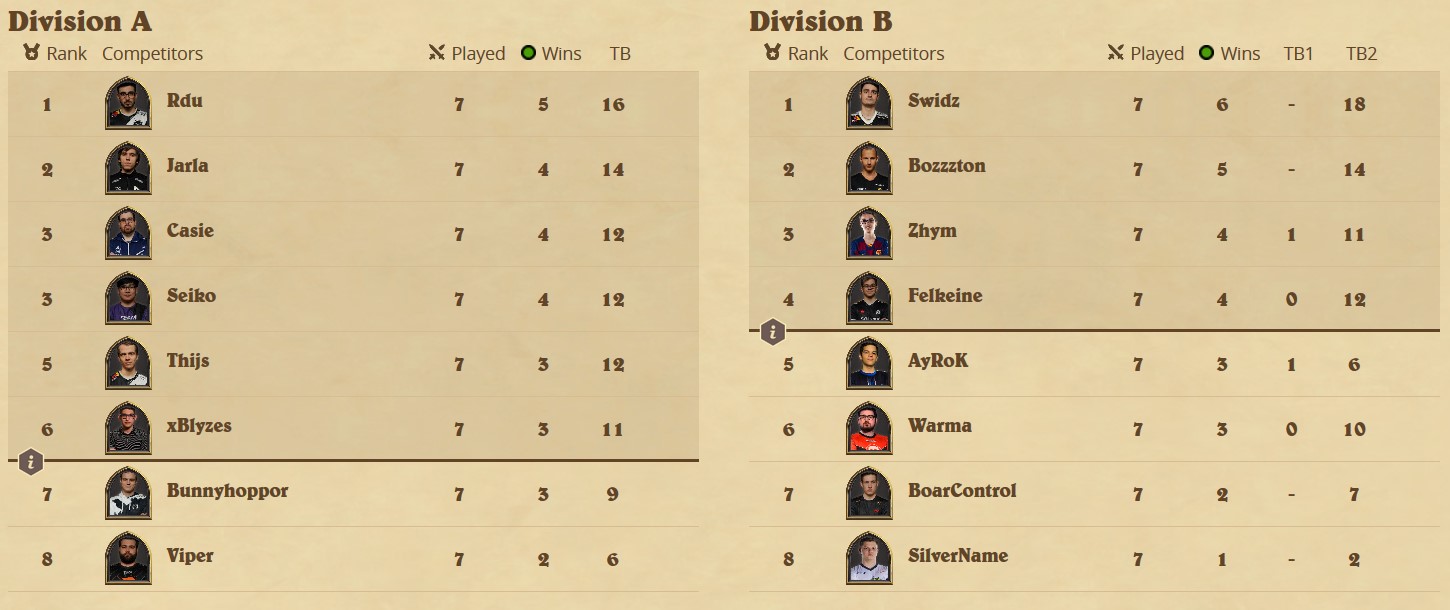 Ryvius was the only player this week to bring Paladin, as he continued to put his faith in the light despite being in big danger of getting relegated. He was able to get a relatively easy win on the first try against posesi's Rogue but struggled against Alutemu in some very close matches, requiring the maximum three tries before getting over the line.