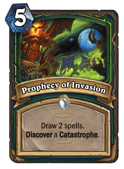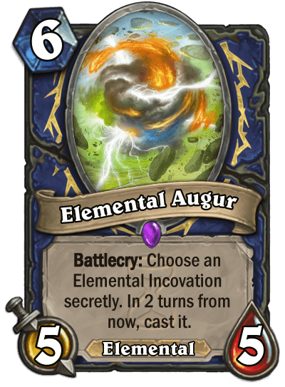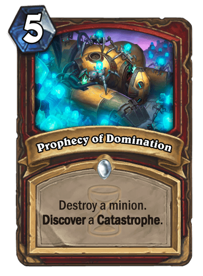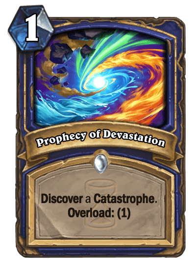 MrRhapsody: I wanted to make the Catastrophes more accessible and versatile with some specific cards for each class, that's where the Prophecy mechanic came from. They have weak effects for the cost, but let's you Discover a Catastrophe of any cost (From your class, of course) some examples are the Prophecy of Devastation and the Prophecy of Domination. At first, all classes had a Prophecy, but since it was limitating my creativity, i had to scrap some of them, like the Prophecy of Rebellion for hunter, or the Prophecy of Darkness for Rogue. Also, they are all common for a reason, arena is way too boring nowadays, it needs some spicyness! And about the Augurs, they are minions with powerful battlecries that triggers after a certain number of turns, usually 2 or 3, some of them requires a target like Undeath Augur, others triggers the effects by themselves, like Elemental Augur. The Augur mechanic was something i came up very late in the creation process, i thought that Catastrophes and Prochecies were not enough, so the Augurs came in to fill the void in a natural and flavourful way.