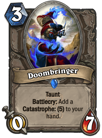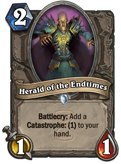 MrRhapsody: "Actually, it originated from a brainstorm, i know i wanted to make a apocalype themed expansion, but i had no idea of what kind of new keyword i wanted, it's very hard to come up with new keywords nowadays, it seens like the custom cards community has already came up with every possible idea. So instead of trying to find "diamonds in the mud", i went to a "jewelry", wich is Hearthstone, and played some games in search for new ideas. Then, during a game againts a Reno Priest, the opponent played a perfect Kazakus potion, and i wondered "Hum, you now what? I like the kazakus potion mechanic, but i don't like the RNG, what if i make something like it, but more specific?" Ideas came and went, and eventualy i came up with the Catastrophe mechanic. The first Catastrophes and its generators were a LOT more powerful and some had totally diferent effects, most of them got scraped, the only generators who remained close to the origirals are Prophecy of Invasion, Herald of the Endtimes and Doombringer."
