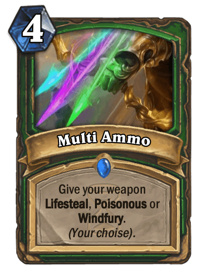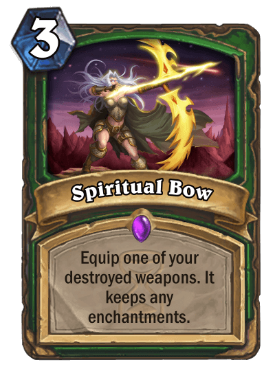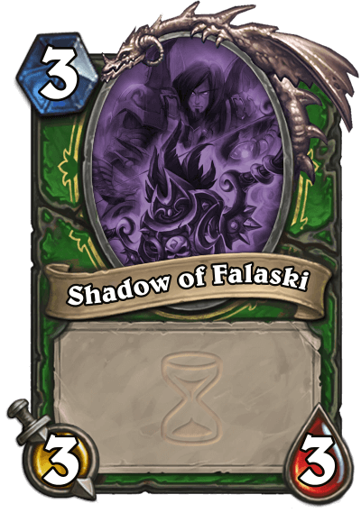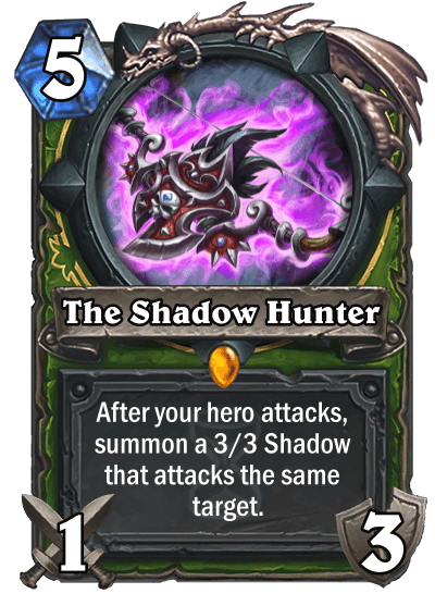 MrRhapsody: "As many of my cards, The Shadow Hunter card and the Shadow of Falaski was inspired by a song from Angra, wich was written out of a tale of a crusader knight (EXCELENT song, btw). Back to the card, The Shadow Hunter was originally created to support the Spell Hunter archetype, wich i loved to play back in 2017/18, but i didn't know how to make a flavourful and functional effect for it. At first it was supposed to be a more controlish style Hunter card, and summoned the Shadow only if you attack a minion, but unlike DH, hunters have no acess to Healing, so sadly i had to cut the idea. But after a little brainstorm, i came up with something that could indirectly support Spell Hunter, and that is the Weapon Hunter archetype, with cards like Multi Ammo, Spiritual Bow and Signature Weapon."