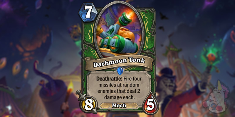 • Darkmoon Tonk looks strong. If the video is to be believed, then the missiles can hit the same enemy more than once, so if there isn't any minions on board, your opponent is looking at taking 8 damage from the deathrattle alone.