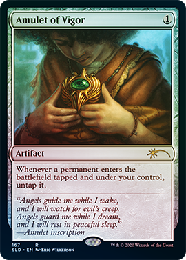 - 1x Unique code to redeem one (1) copy of each Secret Lair Drop Amulet of Vigor, Collected Company, Consecrated Sphinx and Teferi’s Protection for use in Magic Online.