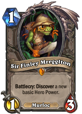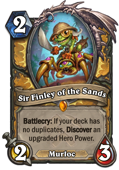 Sir Finley of the Sands is my favourite card because it brings back the character in this new heroic perspective, but remaining true to the original card. The art shows Sir Finley riding a creature and ready for adventure, justifying the extra cost and stats. In addition, the card features a battlecry that brings back the mechanic "If your deck has no duplicates ...", introduced by Reno Jackson the first time we saw the League of Explorers in Hearthstone, and the option to discover an upgraded hero power, effect that matches this new version of Finley.