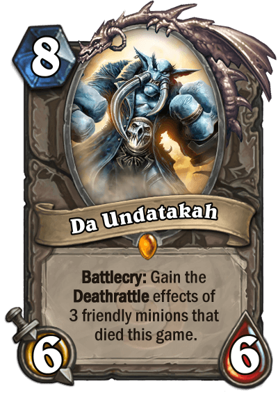 Neoguli: "I’d say there isn’t much of an identity for the Neutral set, as its main purpose is to allow classes to cover some of their weaknesses and to provide tech cards. But one thing is for certain - it’s got a lot more stuff to work with, ranging from Fatigue queen Conjured Mirage to value generator Gazlowe to my part-time lover Da Undatakah (so is Vectus and [Hearthstone Card (N’Zoth, the Corruptor) Not Found], but Da Undatakah is the safest one of ToDSL - Trinity of Deathrattle Synergy Legendaries, and with the Deathrattle cards I included, it turned out to provide pretty fair AoE for some classes)."