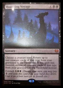 Haunting Voyage is pretty neat as well. I think that's the first one we've seen with a foretell effect and cost that's greater than the straight mana cost. Only trouble with this card (and any reanimation cards) is there is so much exile from graveyard or exile from play cards going around it's tough to build a strategy around it. Anything that has black has pretty much started running a few copies of Cling to Dust. Esper Doom exiles all your best cards. I sort of wish there would be some tech card that returns all cards exiled to your graveyard or something like that.