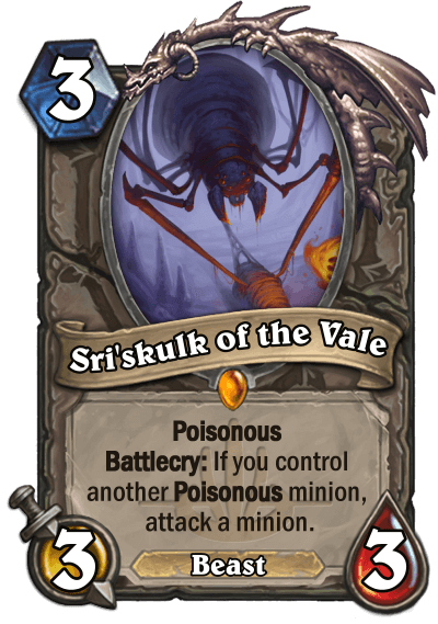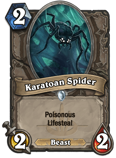 There are no new keywords in Founding of Karatoa, but there is a new mechanic in the form of spells with tribal tags on them. Check out Blood Tap. The set consists of 13 Neutral cards, and 4 cards for each class. Each class gets a Lifesteal card, as well as either a Poisonous card or a psuedo-Poisonous card.