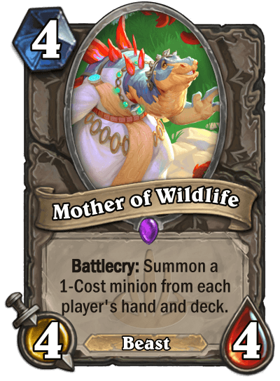 LutriSpellcaster: "This set is about an island off Tirisfal previously hidden by magic being revealed. The dinosaurs there, like Mother of Wildlife, seem of a higher intelligence than those on the mainland. This set has a heavy Lifesteal and Poisonous base, shown with Hypatia and Sri’skulk."