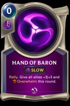 Hand of Baron's text states "Rally. Give all allies +3|+3 and Overwhelm this Round".